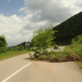 Nous nous octroyons une pause longue déjeuner mémorable au soleil à Srashen, j'en profite pour passer 1h à galérer pour changer mes plaquettes arrières en prévision de la longue descente qui nous attend de l'autre côté de la montagne... vivement ! De notre promontoire nous avons une vue imprenable sur la plaine du Haut-Karabagh. L'après-midi est déjà entamée et les cumulus sont déjà bien formés, nous craignons le traditionnel orage quotidien. Juste après Tsav, dernier village avant le col, nous sentons la pluie venir. Nous avons repéré un coin picnic avec abri à la sortie du village, nous faisons demi-tour et arrivons in-extremis devant l'abri au moment où il commence à pleuvoir. Nous mettons toutes nos affaires à l'abri, Georges compris. On commence à être bon en anticipation des averses. Nous laissons passer l'averse et tergiversons sur le fait de dormir là où de tenter de monter plus haut. Les sites de bivouac risquent d'être assez rare sur les prochains 15km, si on se lance il faudra donc aller plus loin et espéré qu'il ne se remette pas à pleuvoir. Clarisse se sent d'attaque pour tenter le coup et braver les cumulonimbus, nous voilà donc repartis. Nous surveillons le ciel d'un œil inquiet surtout ce gros nuage au loin et nous repérons chaque quoi où nous pourrions planter la tente en cas de besoin. La route est à flanc de montagne et clairement les talus ne sont pas stabilisés, ils s'effondrent régulièrement et ils passent le bulldozer pour rouvrir la route, nous ne pouvons donc pas nous poser n'importe où ça pourrait être risqué.