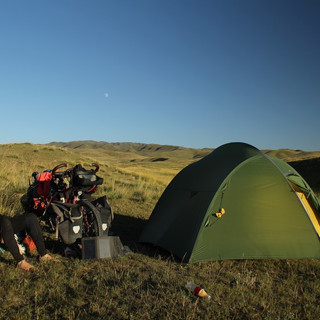 C'est sur un beau promontoire surplombant la steppe que nous bivouaquons pour la première fois tous les quatre. La nuit est froide, nous sentons que l'automne arrive et une fois de plus c'est la gelée qui nous accueille au petit jour.