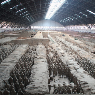 Nous sommes vendredi, Ning travaille, nous en profitons donc pour aller voir l'armée de terre cuite qui est située à 40 km de la ville. Nous prenons un bus devant la gare centrale de la ville qui est située juste à l'extérieur des remparts qui démarquent l'ancienne cité. Une partie a été reconstruite et on peut désormais faire le tour des remparts à pieds ou en vélo (le tour fait 14 km tout de même) . L'armée de terre cuite est un des lieux les plus touristiques de Chine, nous ne sommes pas dans la haute période tant mieux car, lorsqu'on voit la taille du bâtiment de billetterie, on peut imaginer le monde qu'il peut y avoir. Le site se compose de trois « fosses » où on été excavés les fameux soldats et animaux, il y en plus de 2000 de visibles mais il est estimé qu'il y en aurait 6000. Outre les rangées de centaines de statues tournées vers l'Est, on peut aussi apercevoir quelques parties de « corps » pas encore extraites du sol : ici une main, là un visage, ici encore un pied... Le travail de fouille est toujours en cours sur le site, on peut même voir des soldats en cours de reconstruction, car bien sûr ils ont été totalement brisés par le temps, les reconstituer est un véritable puzzle qui nécessite de 6 mois à 3 ans par statue ! Cette armée date de plus de 2000 ans et était là pour protéger le mausolée de l'Empereur Qin Shing Huang situé 2 km plus à l'ouest (c'est aussi lui qui est à l'origine de la grande muraille de Chine).