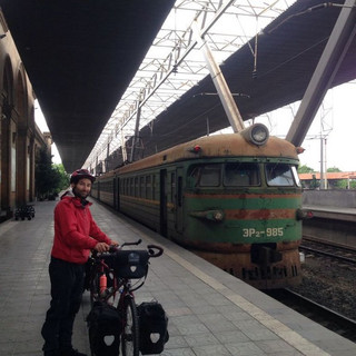 Le train arrive, il a vécu ça se voit ! Nous montons dans le dernier wagon, les contrôleurs nous aident avec le tandem, c'est parti pour notre 1er voyage en train dans une ancienne république du bloc soviétique.